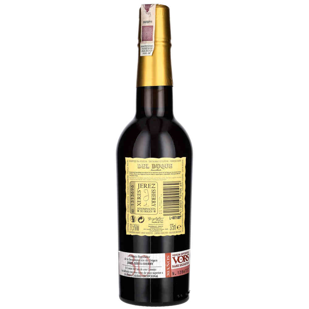 SHERRY DEL DUQUE AMONTILLADO VORS - sherry o mocy 21,5% alkoholu charakteryzuje się aromatami jabłka, miodu i dzikich kwiatów. Na podniebieniu owocowe, z delikatnym i zrównoważonym smakiem. Idealne do serwowania schłodzone, w kieliszku o lekko zwężonej czaszy, co podkreśla aromaty. Doskonale komponuje się z aromatycznymi serami, długo dojrzewającymi wędlinami. Może być podawane jako aperitif.