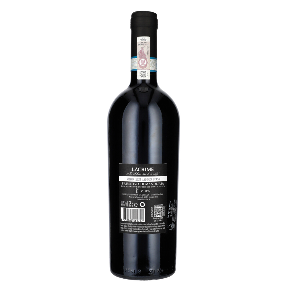 Lacrime Primitivo di Manduria to wytrawne czerwone wino z Apulii, stworzone w 100% ze szczepu Primitivo. Ma głęboką rubinową barwę i intensywny bukiet dojrzałych ciemnych owoców – śliwek, jeżyn i wiśni – wzbogacony nutami wanilii, kakao, przypraw i delikatnego dymu. W smaku pełne, aksamitne i złożone, z dobrze zbalansowaną kwasowością, lekką taniną i długim finiszem. Idealnie komponuje się z czerwonym mięsem, dojrzewającymi serami oraz daniami kuchni włoskiej.