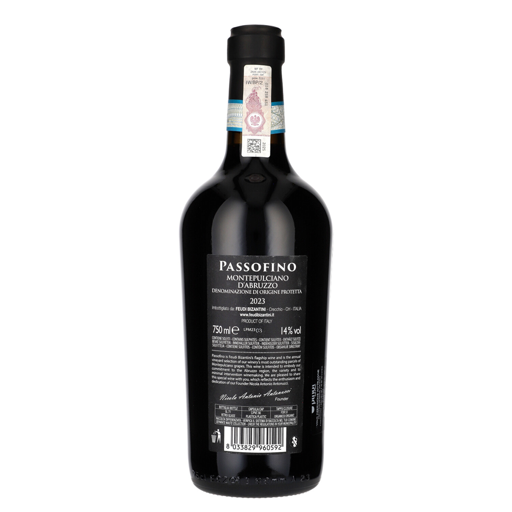 Passofino Montepulciano d'Abruzzo od Feudi Bizantini to wyraziste czerwone wino o aromatach śliwek, czarnej porzeczki, wiśni morello, uzupełnionych nutami cynamonu i śródziemnomorskich ziół. Na podniebieniu wytrawne, soczyste i kremowe, z delikatną resztkową słodyczą oraz umiarkowaną kwasowością, która nadaje winu łagodności.