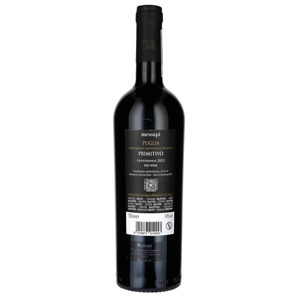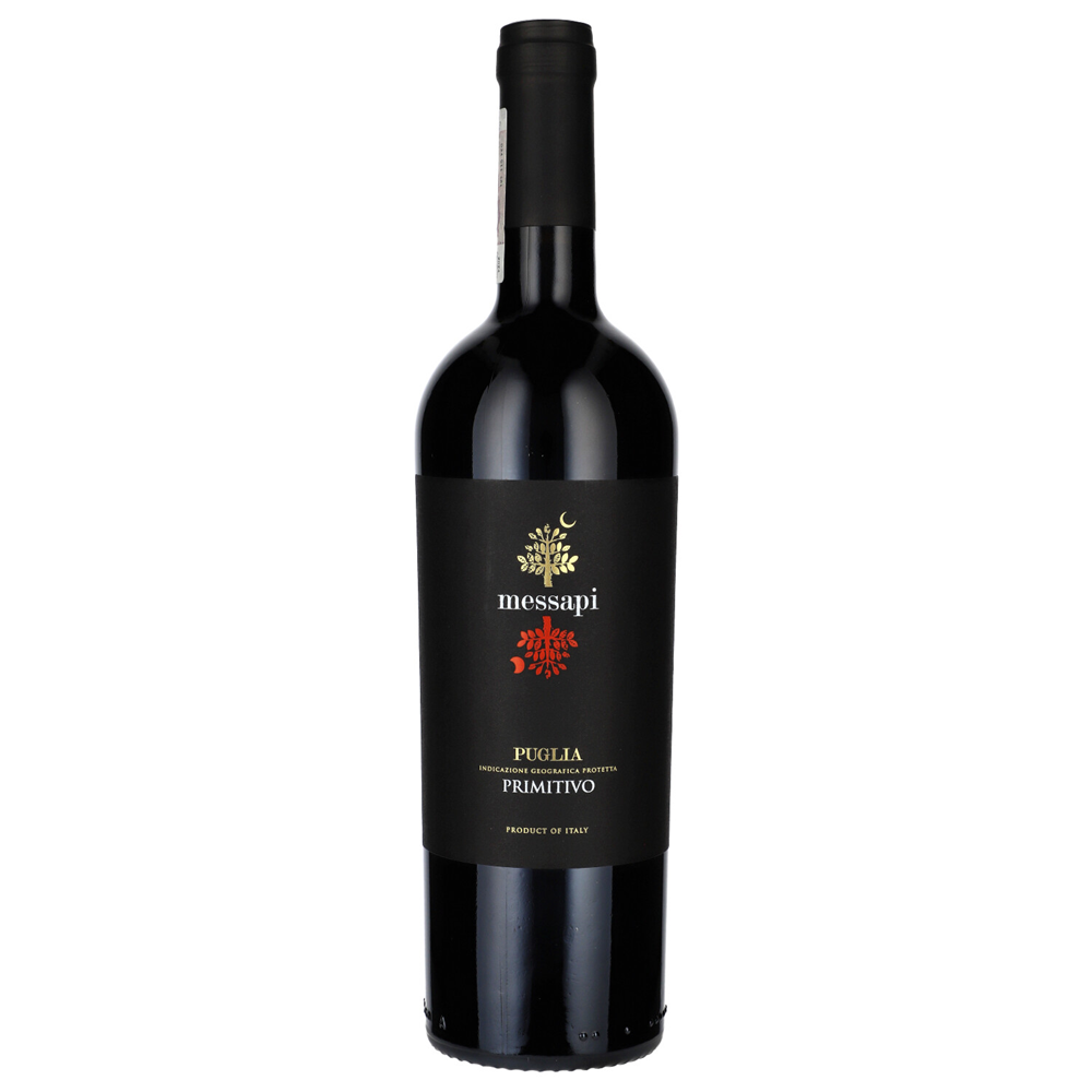 Messapi Primitivo IGP Puglia 14% to bogate i intensywne czerwone wino wytwarzane z winogron Primitivo, które słynie z wyrazistych smaków i głębi. Pochodzące z regionu Puglia w południowych Włoszech, wino to charakteryzuje się głęboką rubinową barwą oraz bukietem ciemnych owoców, takich jak dojrzałe wiśnie, śliwki i maliny, z nutami przypraw, pieprzu i skóry. Jest pełne, o gładkich taninach i zrównoważonej kwasowości, co doskonale uzupełnia jego owocowy charakter.