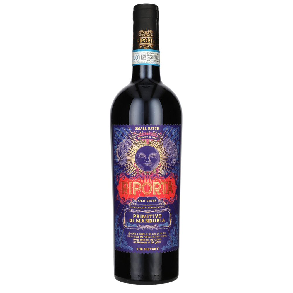 Riporta Primitivo di Manduria DOC to czerwone wino o głębokim rubinowym kolorze z fioletowymi refleksami. W aromacie intensywne nuty czerwonych owoców, wiśni i jeżyn.