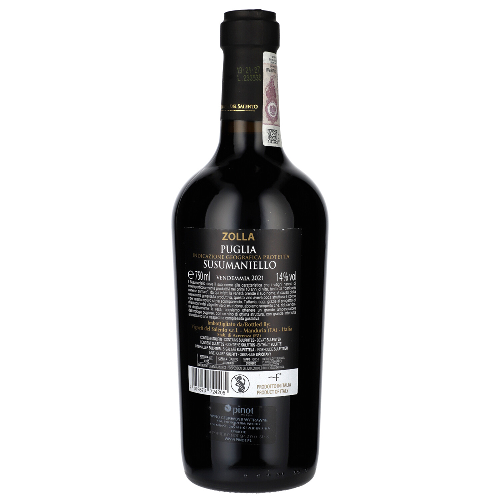 Zolla Puglia Susumaniello IGP 2021 to doskonałe czerwone wino, które wyróżnia się bogatym bukietem i wytrawnym smakiem. Produkowane w malowniczym regionie Puglia, to wino zawdzięcza swoje niezwykłe walory winogronom odmiany Susumaniello, które zapewniają mu charakterystyczną głębię.