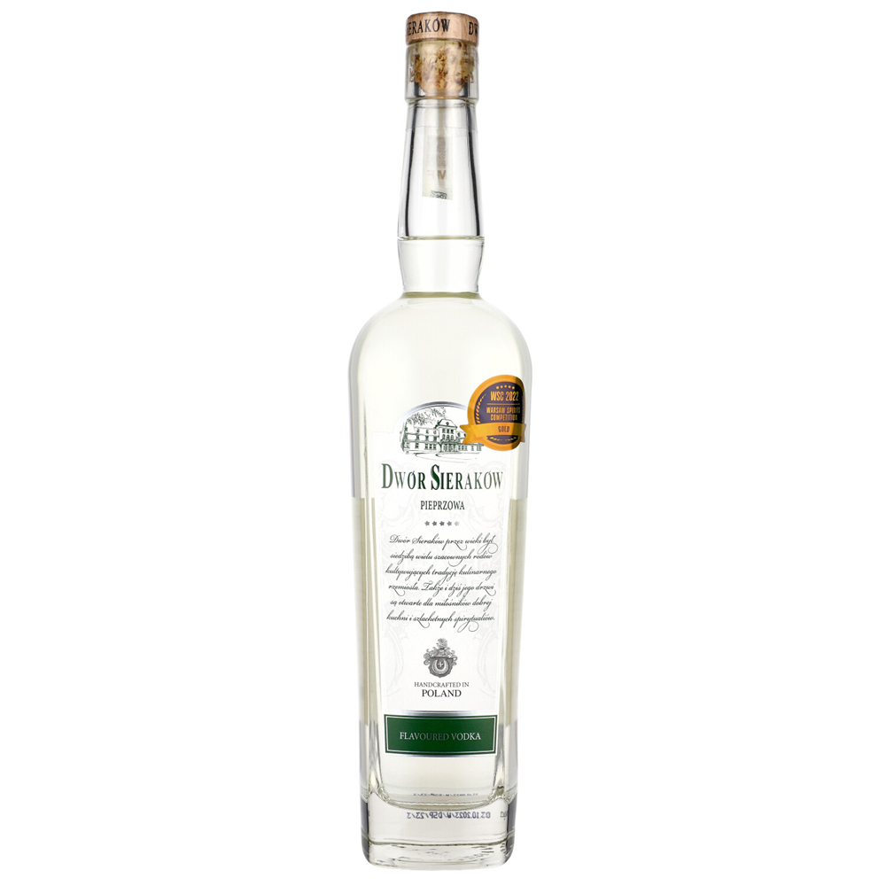 Dwór Sieraków Pieprzowa to wysokiej jakości wódka smakowa, będąca hołdem dla polskich tradycji produkcji alkoholu. Wytwarzana w malowniczym Dworu Sieraków, wyróżnia się intensywnym, pikantnym smakiem z wyraźnymi nutami pieprzu, który przyjemnie rozgrzewa podniebienie. Delikatne tło zbożowe uzupełnia ten wyrazisty profil, nadając trunkowi wyjątkową harmonię smaków.