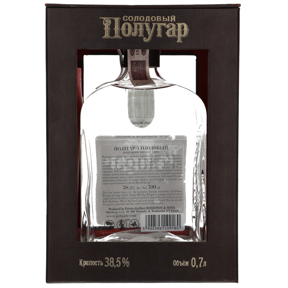 To wynik benedyktyńskiej pracy Borisa Rodisonova, stosującego tradycyjną technologii potrójnej destylacji wyselekcjonowanego żyta najlepszej jakości w prawdziwych zrekonstruowanych miedzianych alembikach, oczyszczany białkiem kurzych jaj i węglem brzozowym. W kompozycji tej znajduje się część słodowanego i nie słodowanego żyta. Polugar rozlewany jest do kopii połustofu Jelizawiety Pietrowny o pojemności  0,615 L.