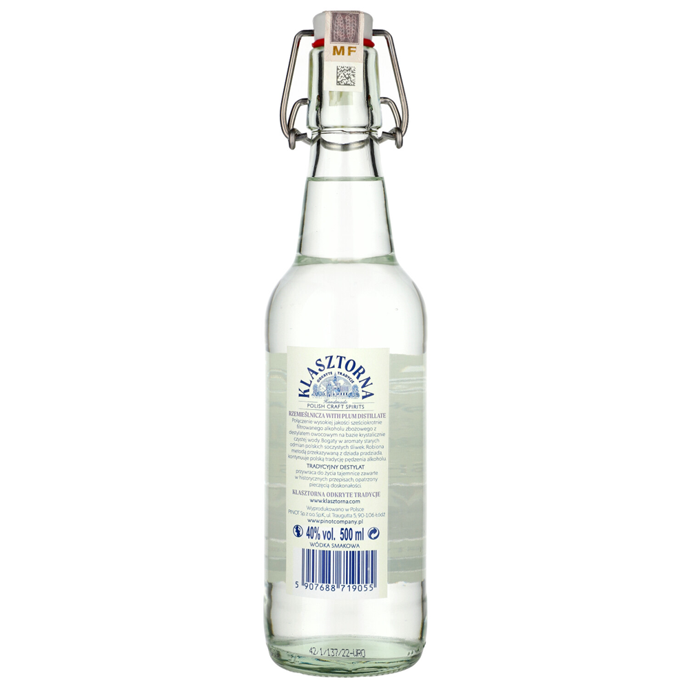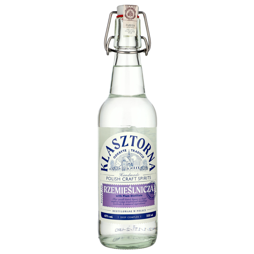KLASZTORNA RZEMIEŚLNICZA Klasztorna Rzemieślnicza stanowi niezwykle ważną kontynuację polskiej tradycji pędzenia alkoholu metodami przekazywanymi z dziada pradziada. Połączenie wysokiej jakości polskiego alkoholu zbożowego sześciokrotnie filtrowanego z destylatem owocowym na bazie krystalicznie czystej wody. Bogata w aromaty owoców starych odmian polskich soczystych śliwek.